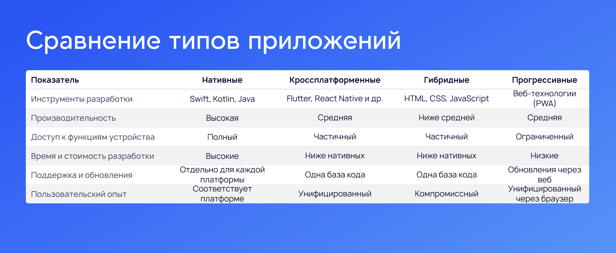 Мобильные приложения различаются по способу разработки и технологии, используемой для их создания. Основные типы приложений — нативные, кроссплатформенные, гибридные и прогрессивные веб-приложения. Рассмотрим их особенности, преимущества и недостатки.