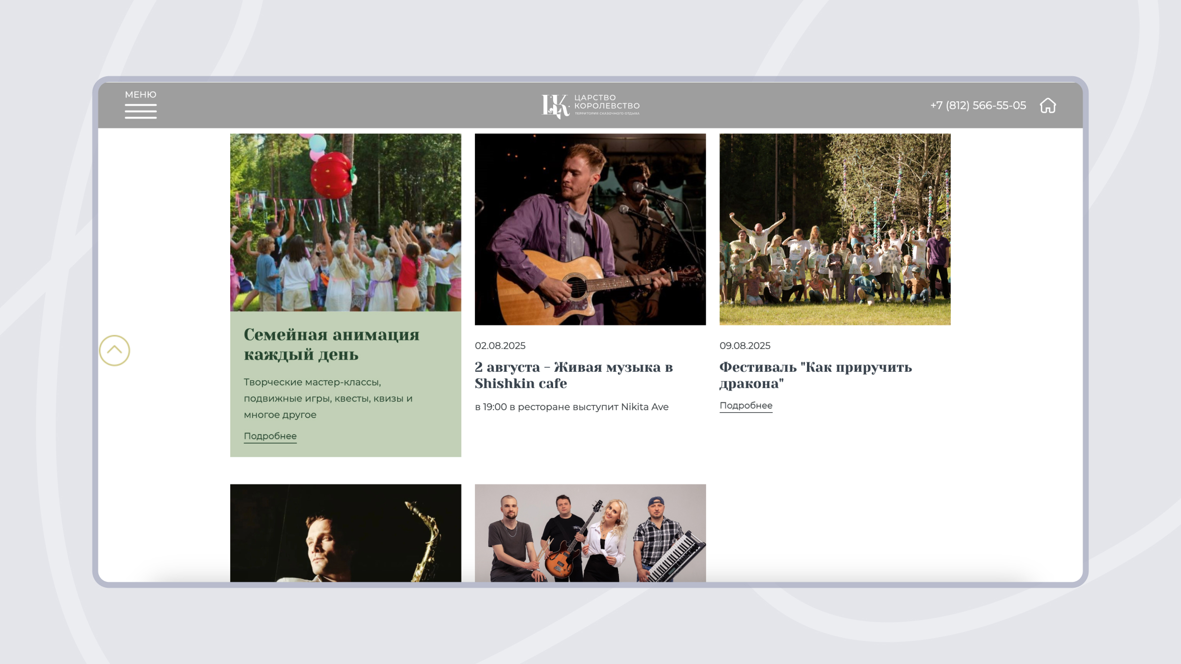 - Разработали отдельные блоки на сайт, опираясь на техническое задание клиента и бренд-бук — раздел с впечатлениями, ресторан и календарь событий.